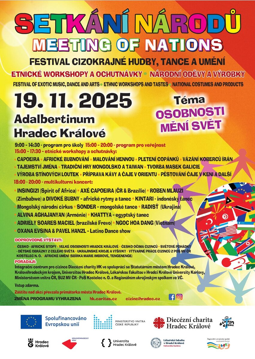 Na letošním Setkání národů, kterým ožije hradecké Adalbertinum ve středu 19. listopadu 2025 od 9 do 20 hod. (Čs. armády 300, Velký sál), se mohou návštěvníci seznámit s kulturou více než dvaceti zemí čtyř kontinentů a také jejich osobnostmi. 12. ročník festivalu nabídne i nové etnické workshopy a ochutnávky, ukázky národních oděvů a výrobků, koncert a výstavy. Hlavní téma „Osobnosti mění svět“ bude rezonovat celým programem pro školy i pro veřejnost. Akci pořádá Integrační centrum pro cizince hradecké Diecézní charity spolu s partnery pod záštitou primátorky města Hradec Králové.